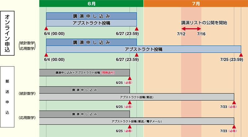 | 6月27日(日)23:59 | オンラインによる講演申込の期限.統計数学および応用数学の分科会以外の分科会・セッションに関しては,アブストラクトのオンラインによる投稿期限. |